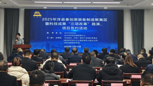 12月19日,由漢中市科學技術局和漢中市科技資源統籌中心指導,洋縣綠色(有機)循環產業園區管委會(秦創原洋縣分中心建設領導小組辦公室)和洋縣發展和改革局主辦的洋縣2025年秦創原裝備制造聚集區暨科技成果“三項改革”路演、項目簽約活動在洋縣有機大廈舉行。
