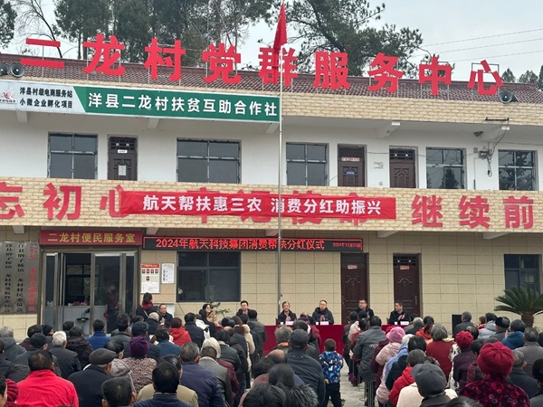 12月25日,航天科技集團2024年消費幫扶分紅儀式在洋縣磨子橋鎮二龍村舉行。航天四院紀委書記魏超、工會副主席張翔、鄉村振興辦公室主任趙陽,洋縣縣委常委劉一葉,縣委常委、紀委書記、監委主任劉子輝,副縣長張建德出席儀式。磨子橋鎮黨委負責同志和二龍村干部群眾代表參加儀式。