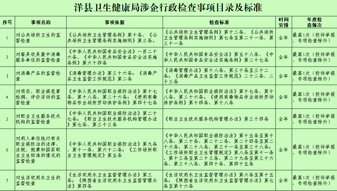 洋縣衛生健康局涉企行政檢查事項目錄及標準
