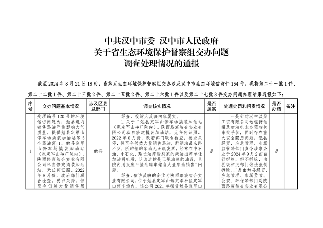 中共漢中市委 漢中市人民政府關(guān)于省生態(tài)環(huán)境保護(hù)督察組交辦問(wèn)題調(diào)查處理情況的通報(bào)(第二十一批1件、第二十二批1件、第二十三批2件、第二十五批2件、第二十六批1件以及第二十七批3件)
