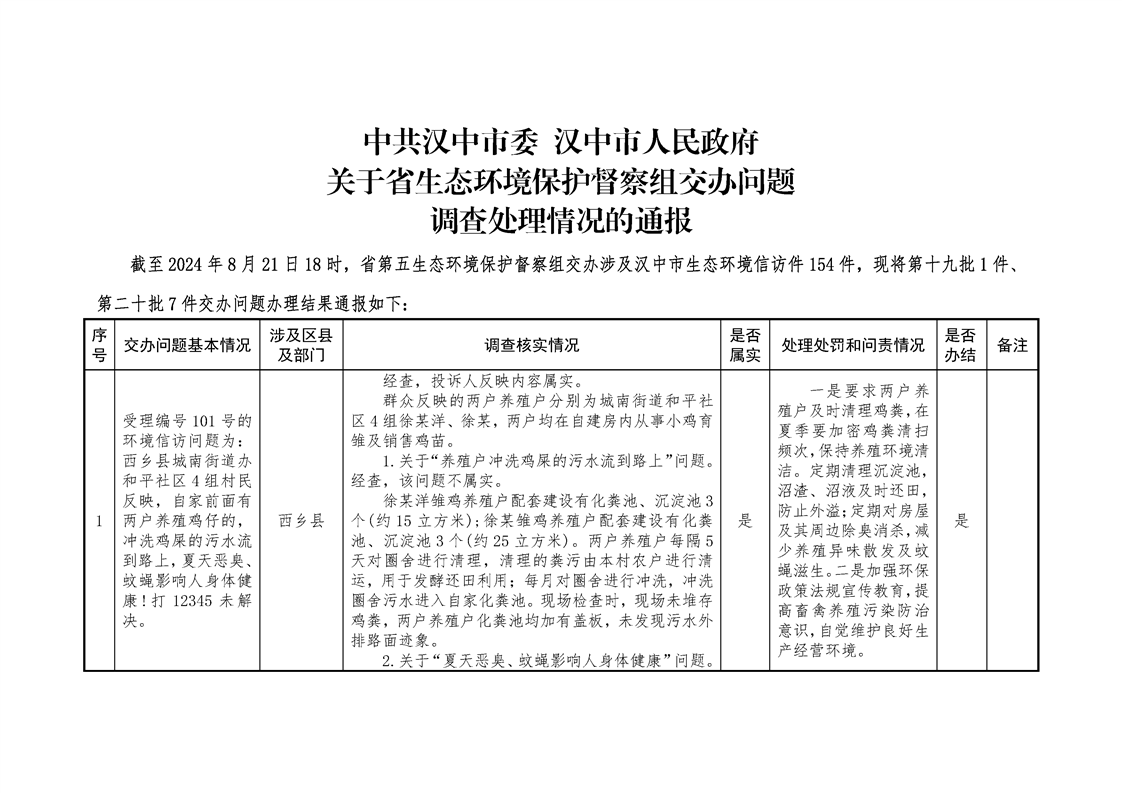 中共漢中市委 漢中市人民政府關于省生態環境保護督察組交辦問題調查處理情況的通報(第十九批1件、第二十批7件)