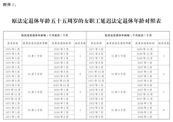 2.原法定退休年齡五十五周歲的女職工延遲法定退休年齡對照表