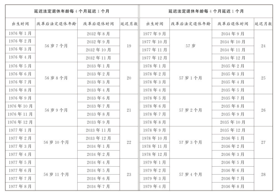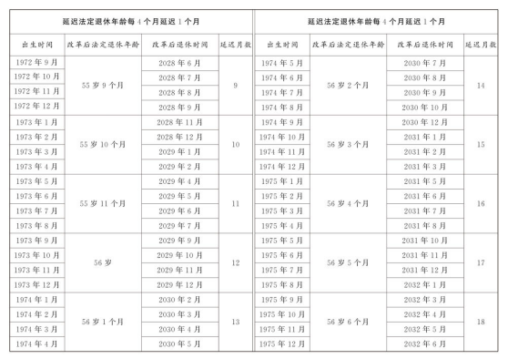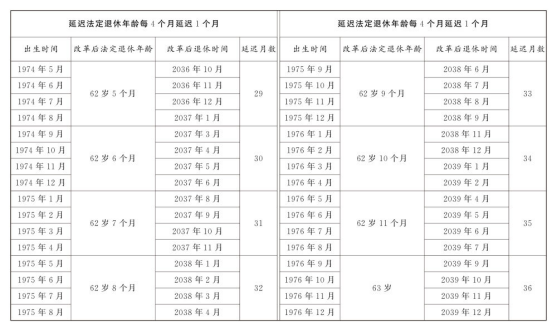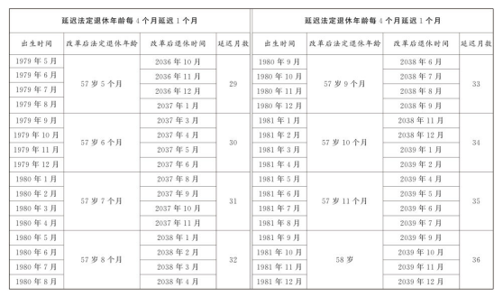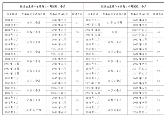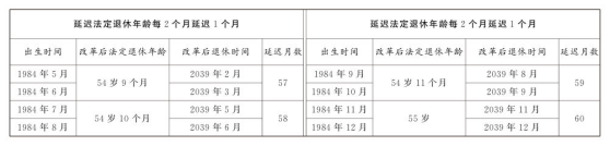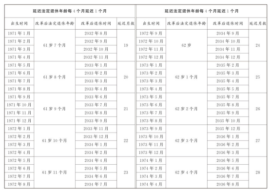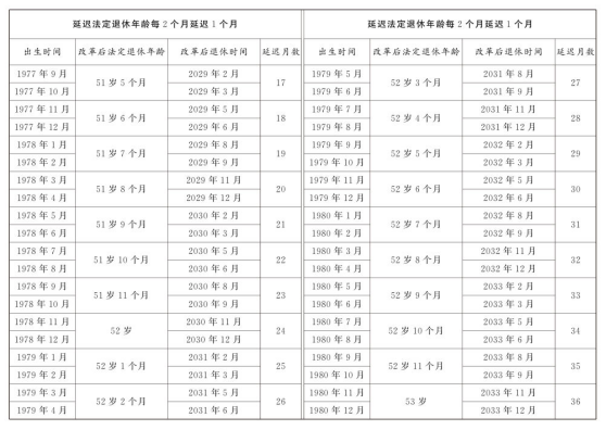 第一條 從2025年1月1日起,男職工和原法定退休年齡為五十五周歲的女職工,法定退休年齡每四個月延遲一個月,分別逐步延遲至六十三周歲和五十八周歲;原法定退休年齡為五十周歲的女職工,法定退休年齡每二個月延遲一個月,逐步延遲至五十五周歲。國家另有規(guī)定的,從其規(guī)定。