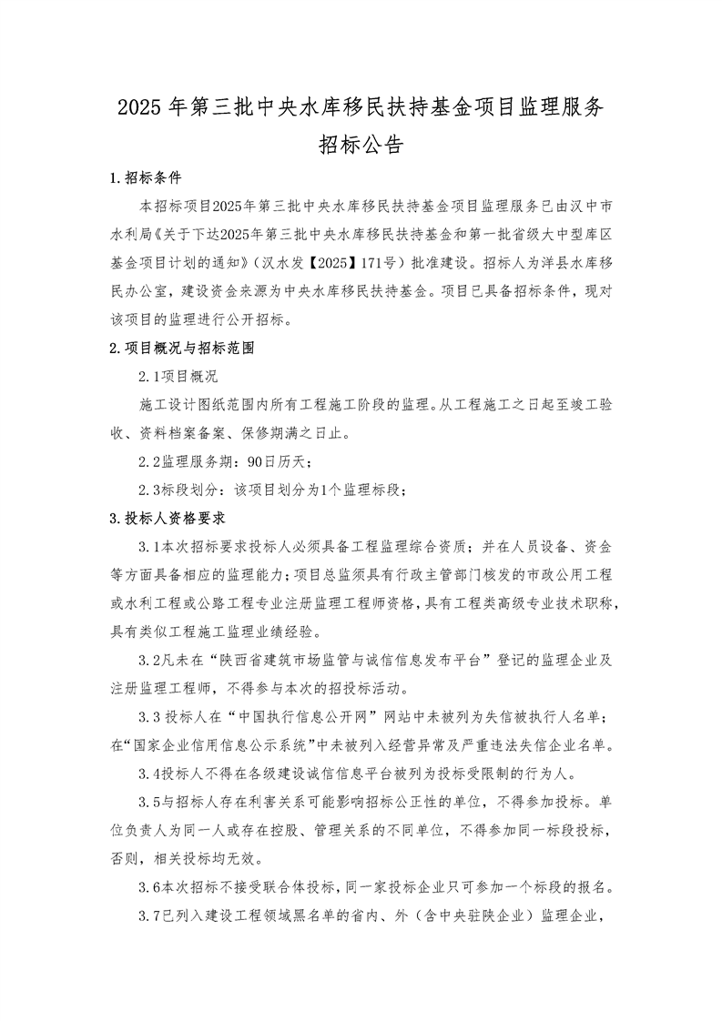 2025年第三批中央水庫移民扶持基金項目監理服務招標公告