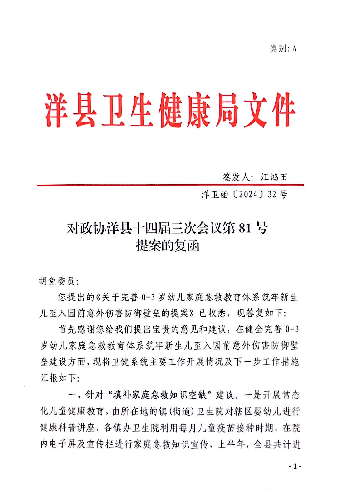 對政協洋縣十四屆三次會議第81號提案的復函 洋衛函【2024】32號