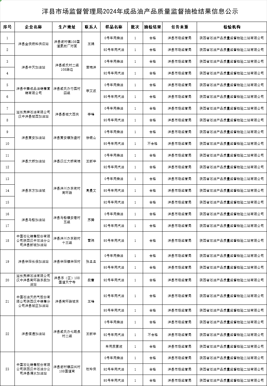 洋縣市場監(jiān)督管理局2024年成品油產(chǎn)品質(zhì)量監(jiān)督抽檢結(jié)果信息公示
