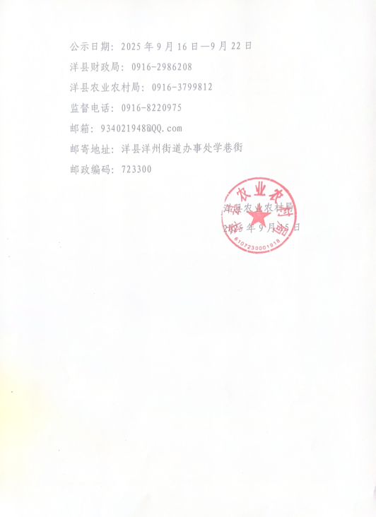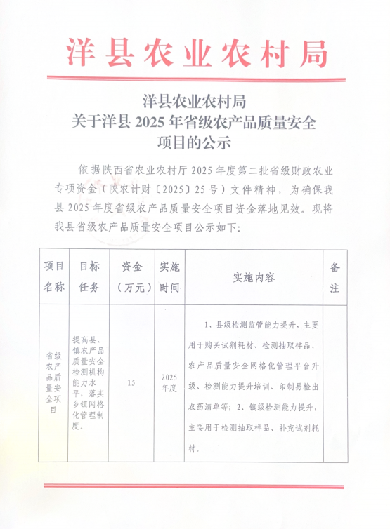 洋縣農業農村局關于洋縣2025年省級農產品質量安全項目的公示