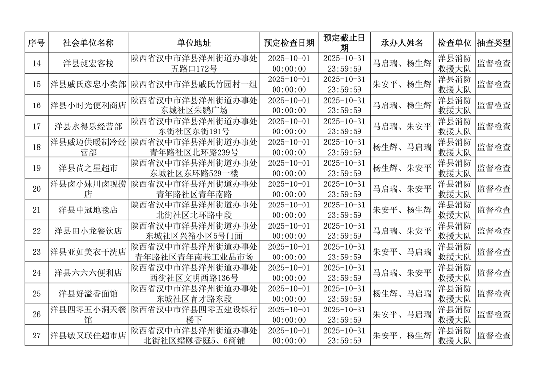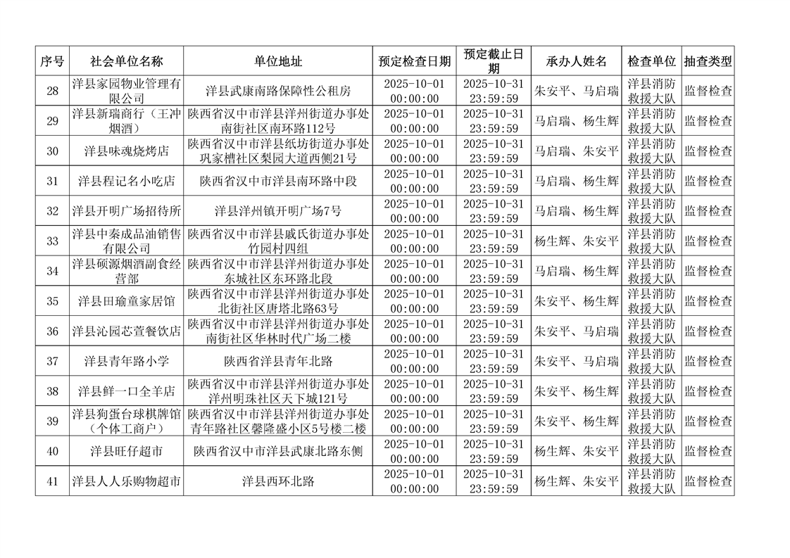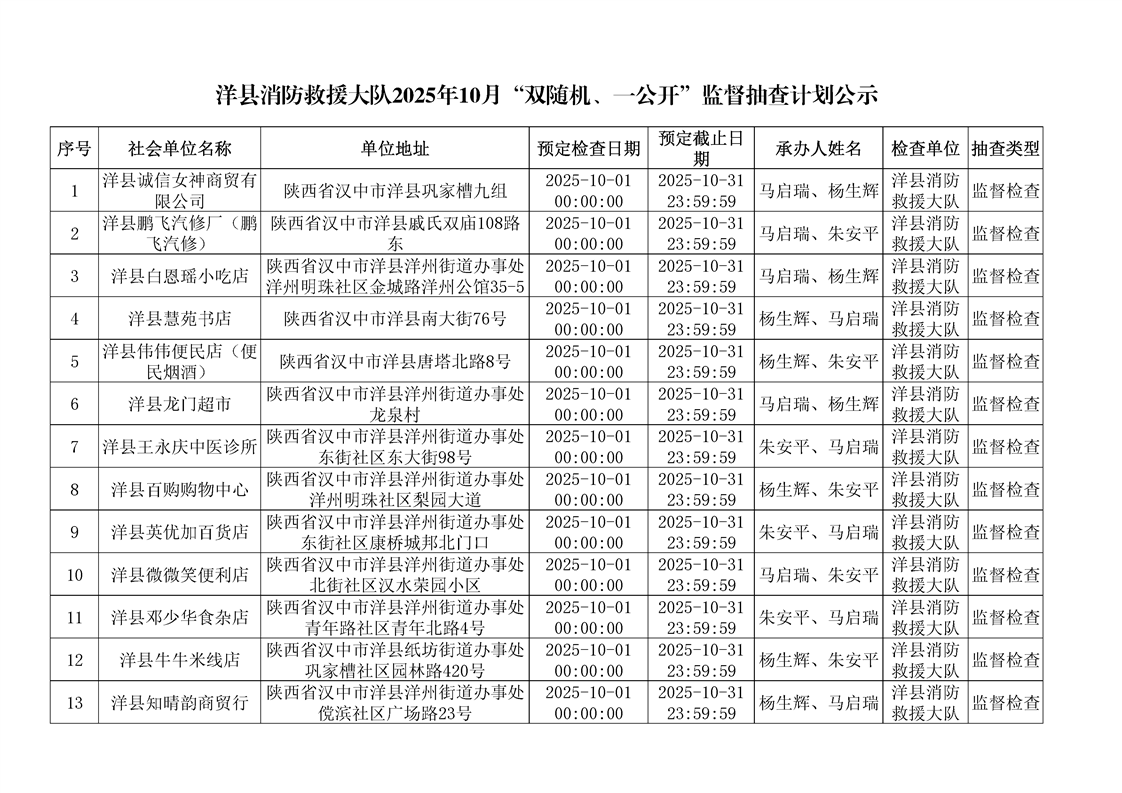 洋縣消防救援大隊2025年10月“雙隨機、一公開”監(jiān)督抽查計劃公示