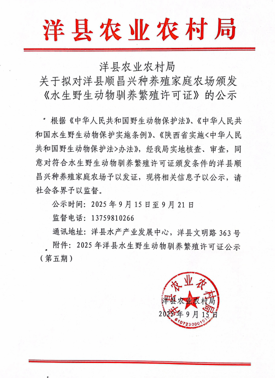 洋縣農業農村局關于擬對洋縣順昌興種養殖家庭農場頒發《水生野生動物馴養繁殖許可證》的公示