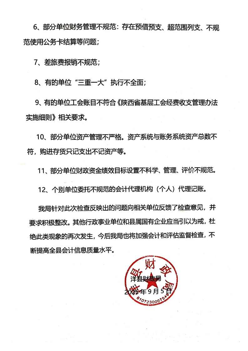 洋縣財政局2025年度會計信息質量監督檢查結果公示