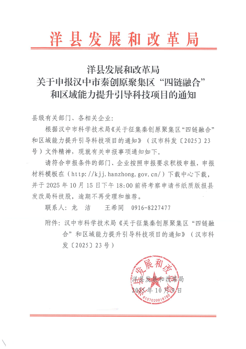 關于申報漢中市秦創原聚集區“四鏈融合”和區域能力提升引導科技項目的通知