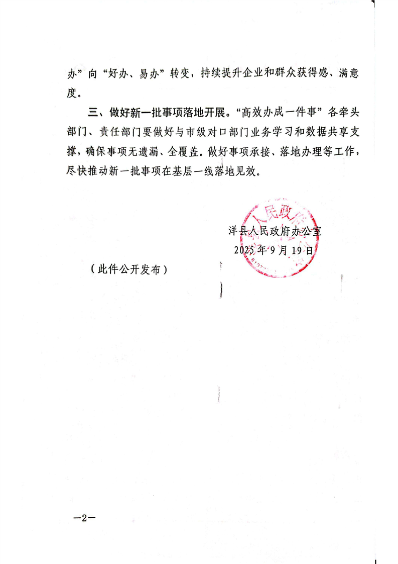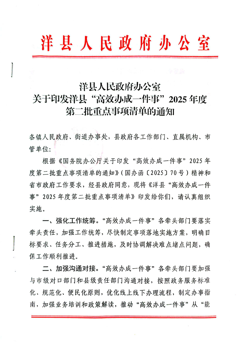 洋縣人民政府辦公室關于印發洋縣“高效辦成一件事”2025年度第二批重點事項清單的通知