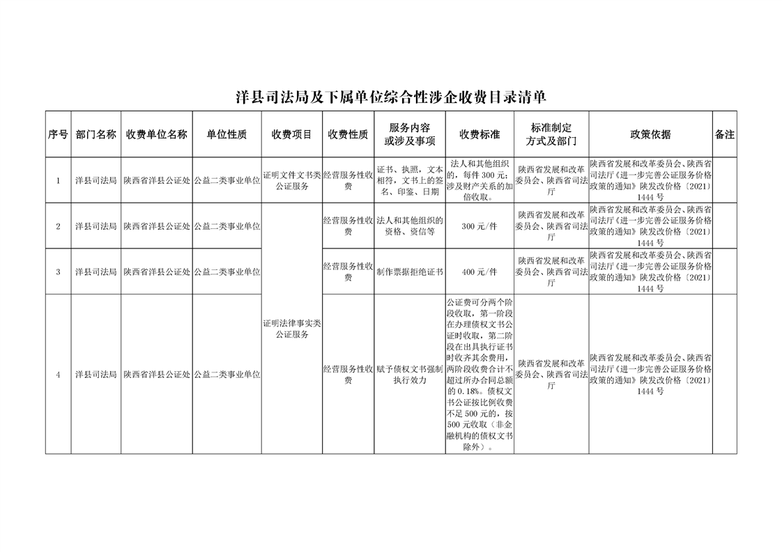 洋縣司法局及下屬單位綜合性涉企收費目錄清單