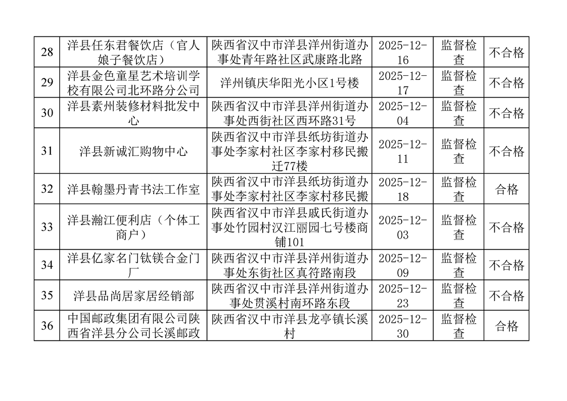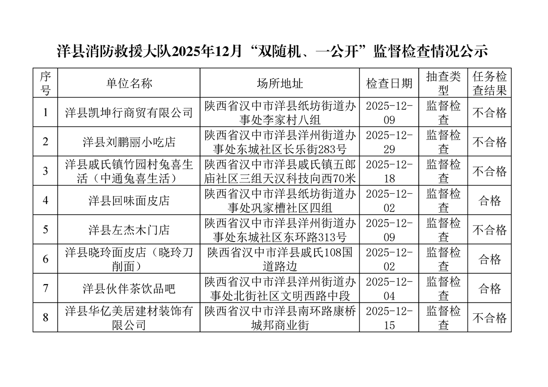 洋縣消防救援大隊2025年12月“雙隨機、一公開”監(jiān)督檢查情況公示