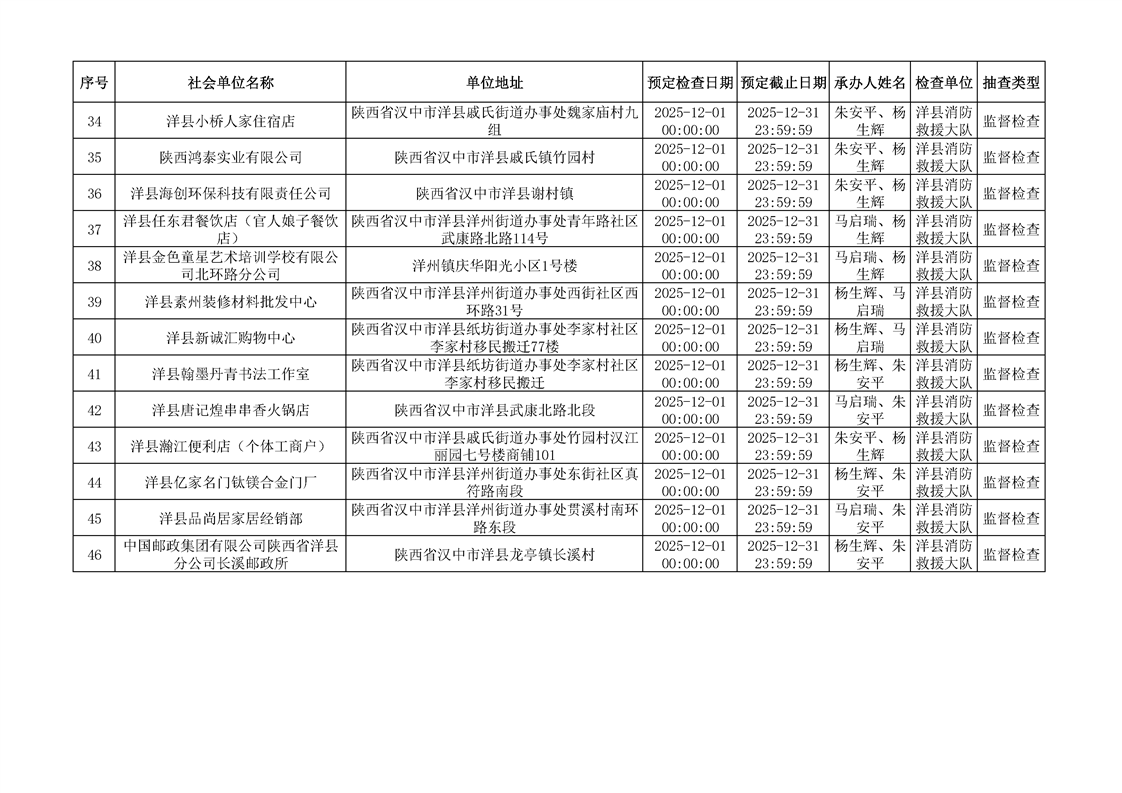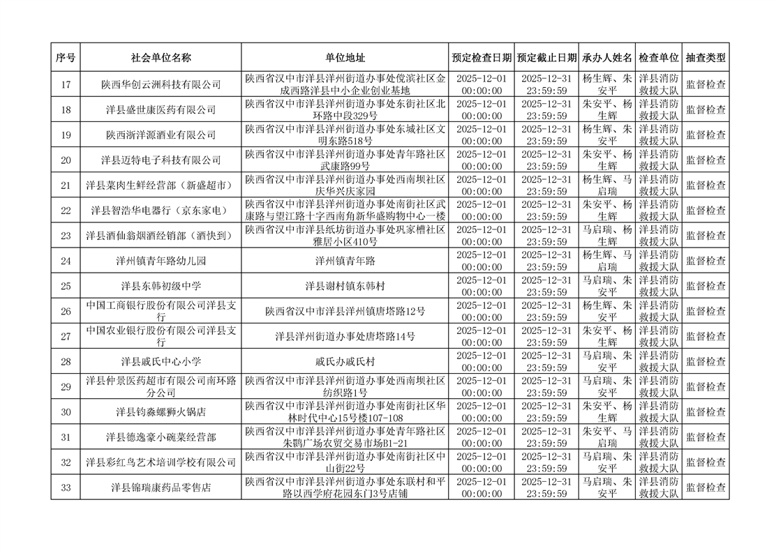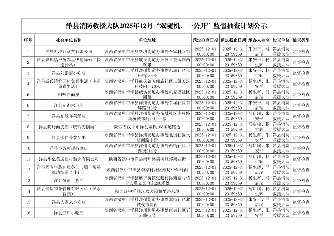 洋縣消防救援大隊(duì)2025年12月“雙隨機(jī)、一公開”監(jiān)督抽查計劃公示