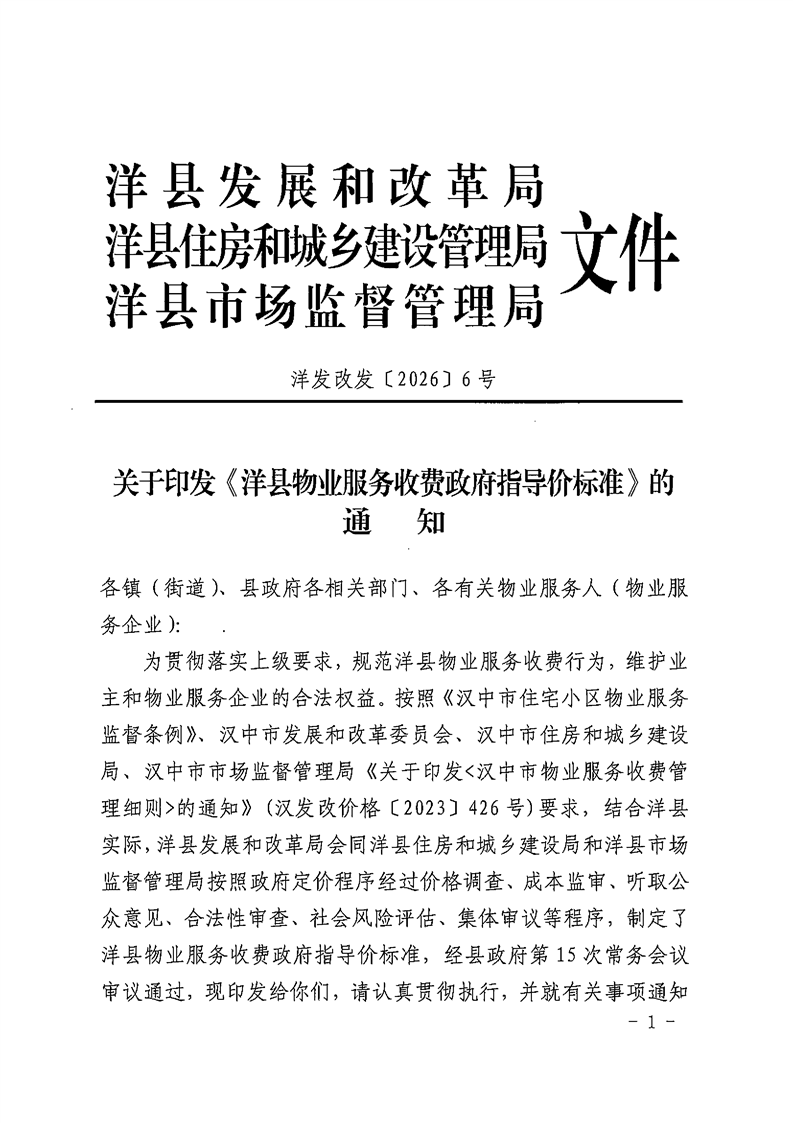 洋發(fā)改發(fā)[2026]6號 關(guān)于印發(fā)《洋縣物業(yè)服務(wù)收費政府指導(dǎo)價標(biāo)準(zhǔn)》的通知