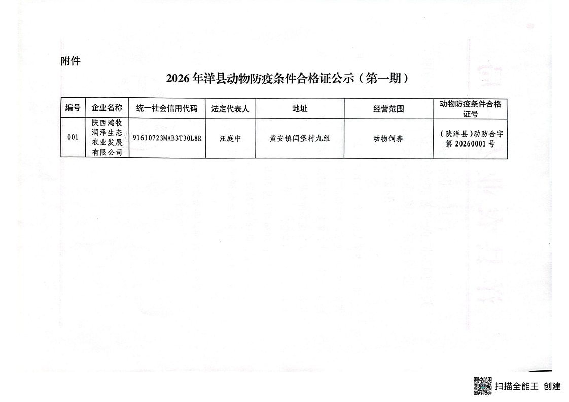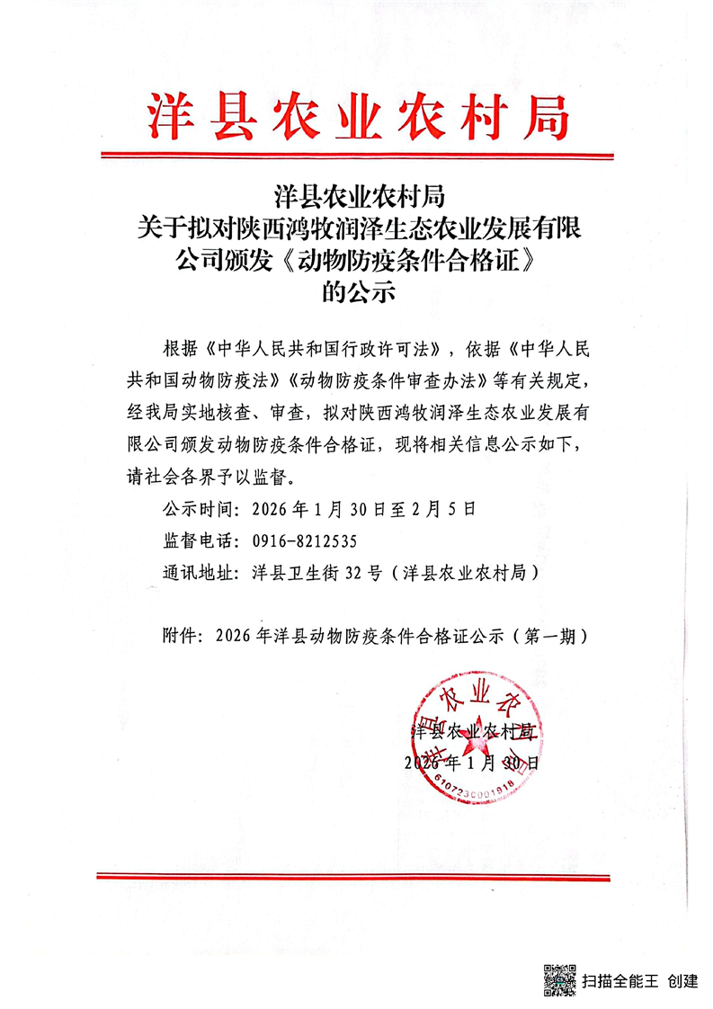 洋縣農(nóng)業(yè)農(nóng)村局關(guān)于擬對陜西鴻牧潤澤生態(tài)農(nóng)業(yè)發(fā)展有限公司頒發(fā)《動物防疫條件合格證》的公示
