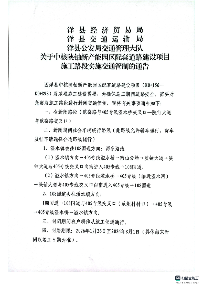 洋縣交通運輸局關于中核陜鈾新產能園區配套道路建設項目施工路段實施交通管制的通告