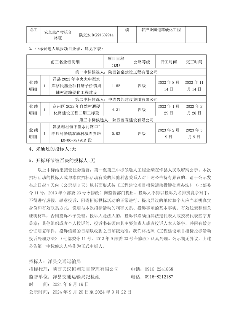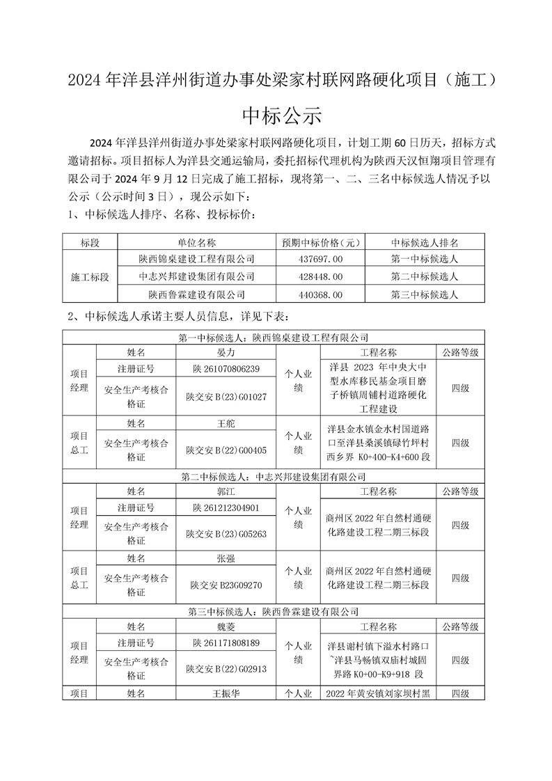 2024年洋縣洋州街道辦事處梁家村聯網路硬化項目(施工)中標公示