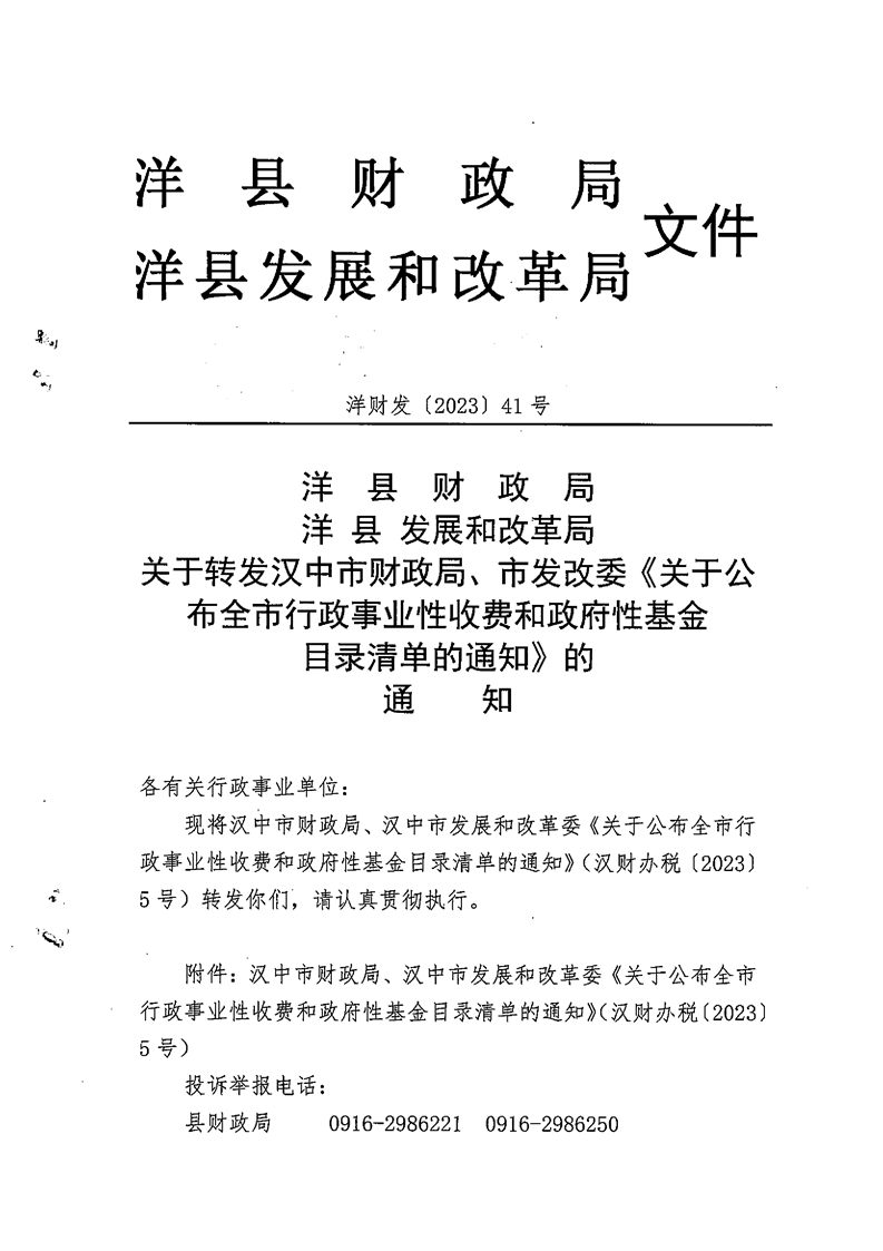 洋財發(fā)〔2023〕41號 關于轉發(fā)漢中市財政局、市發(fā)改委《關于公布全市行政事業(yè)性收費和政府性基金目錄清單的通知》的通知