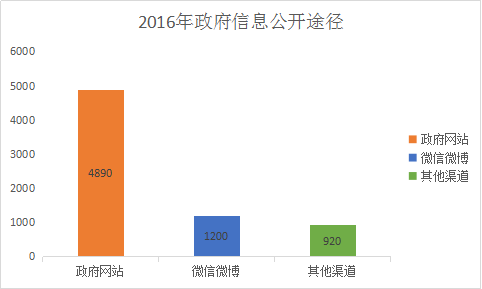 我縣通過政府門戶網站、微信、微博、廣播電視及宣傳欄等途徑主動公開政府信息7010余條,不予公開政府信息18條。截至2016年12月31日,縣政府門戶網站共公開各類政府信息4890余條,其中政務活動類2150條;機構信息類330條;政策法規類360條;規劃計劃類320條;財政信息類580條;業務信息類290條;其他類信息860條(圖一)。通過政府信息公開欄、電視、廣播布信息920余條。微博、微信公開1200余條(圖二)。2016年政府門戶網站點擊量超過190萬人次,新浪政務微博群“粉絲”人數達1.4萬多人。