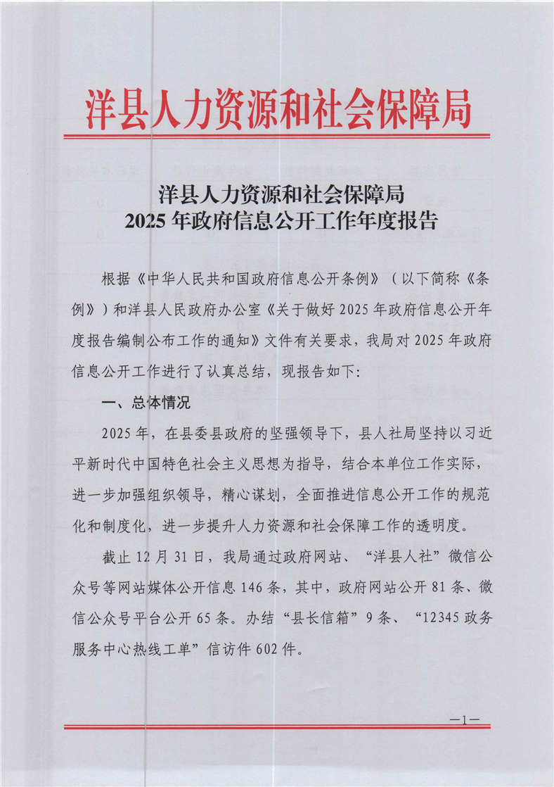 洋縣人力資源和社會保障局2025年政府信息公開工作年度報告